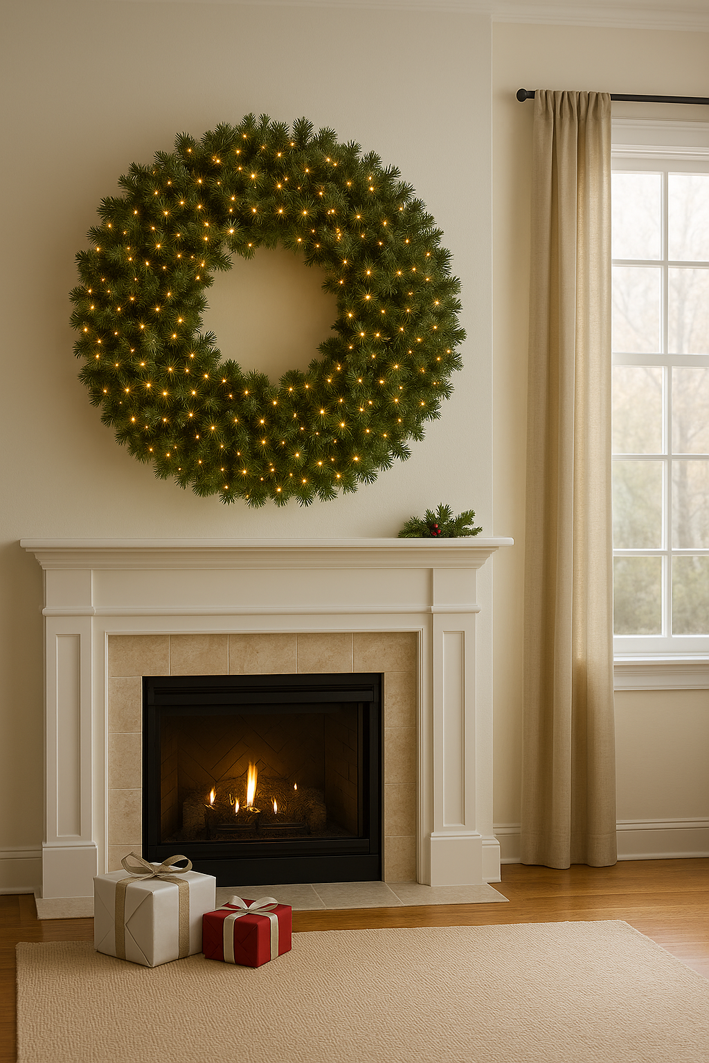 Pre-lit with 600 twinkling 3MM warm white bulbs, it sparkles beautifully while maintaining energy efficiency with low voltage operation. Measuring 48 inches in diameter (with a 24-inch inner opening), it’s generously sized to make a statement indoors or out.