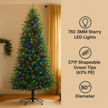 Pre-lit with 750 super-bright 3MM starry LED lights, this tree offers color-changing options (warm white & multi) and 16 dynamic lighting functions, easily controlled by remote or the Aurio Smart APP. Built with Smart Power Pole Technology and Continuous-ON Technology, setup is simple and reliable — even if one bulb goes out, the rest stay glowing.
