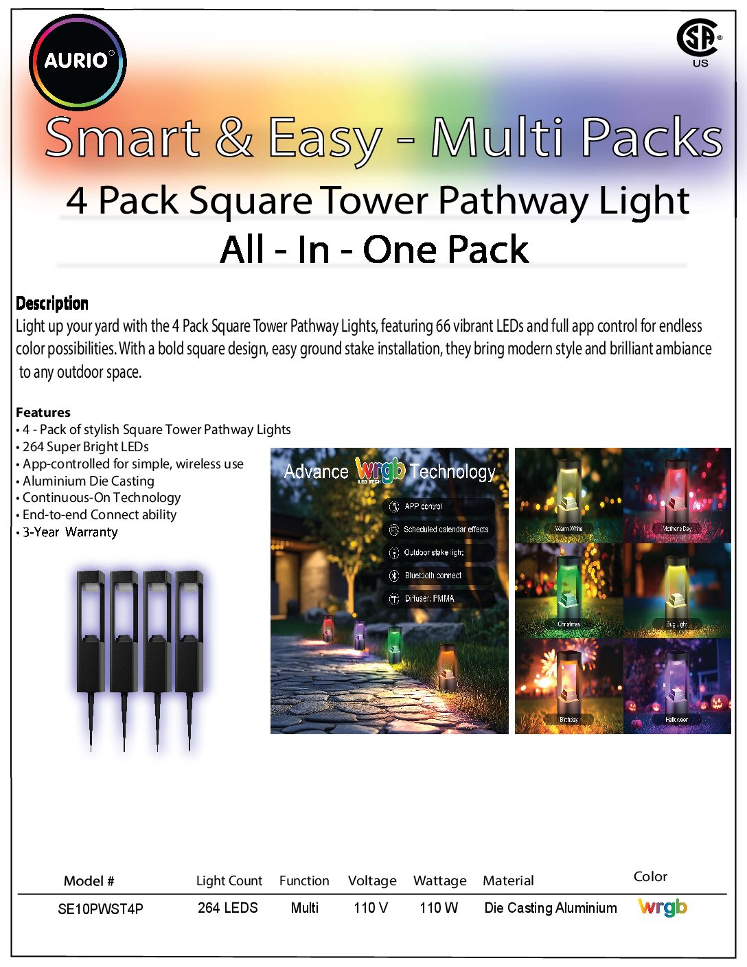 Aurio S&E Square Tower Pathway light can make your outdoor place more quiet and comfortable, due to its tower-shaped design. In addition to the lights, the Multi-pack also includes an S&E speaker controller. After purchasing the Multi-pack, you can simply group multiple lights to achieve a more dynamic performance in the light show.